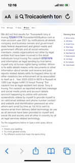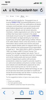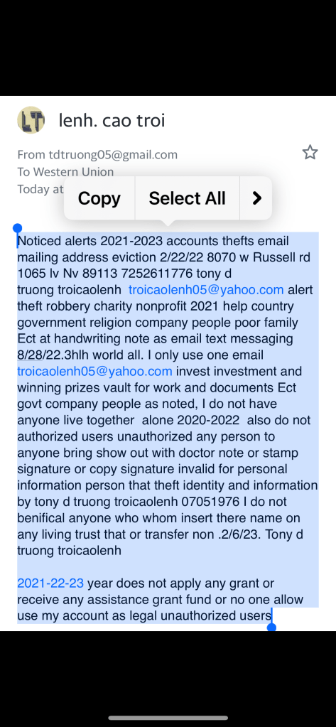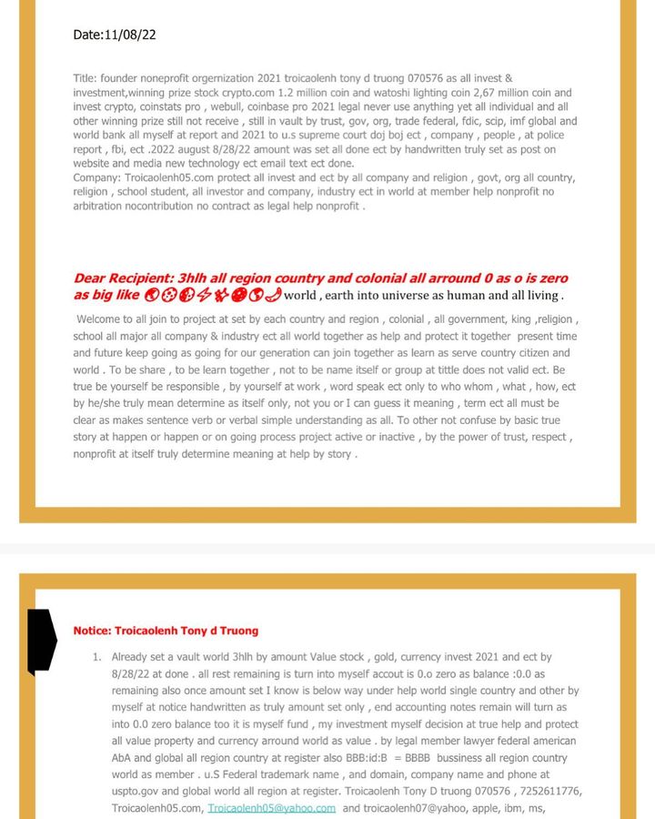 Months to my account and it still hasn’t received any notification from the service provider that my email was received and that it has been sent back and hide in the email address past 2020-2023 present time updates and documents and email addresses ect hack by someone and control my all account and theft all of the information fix edit sue company business people and government all other and fake signs documents and unauthorized user and invalid documents from the ones who whom present it as show or do anything violations criminal activity and I do respect report all government department and police fbi and company business industry person and post social media website new technology text message email all as I can team help team support all other as help tony d truong troicaolenh 07051986 Troi cao lenh06@yahoo.com 7252611776 report to the team for help with this information ℹ️