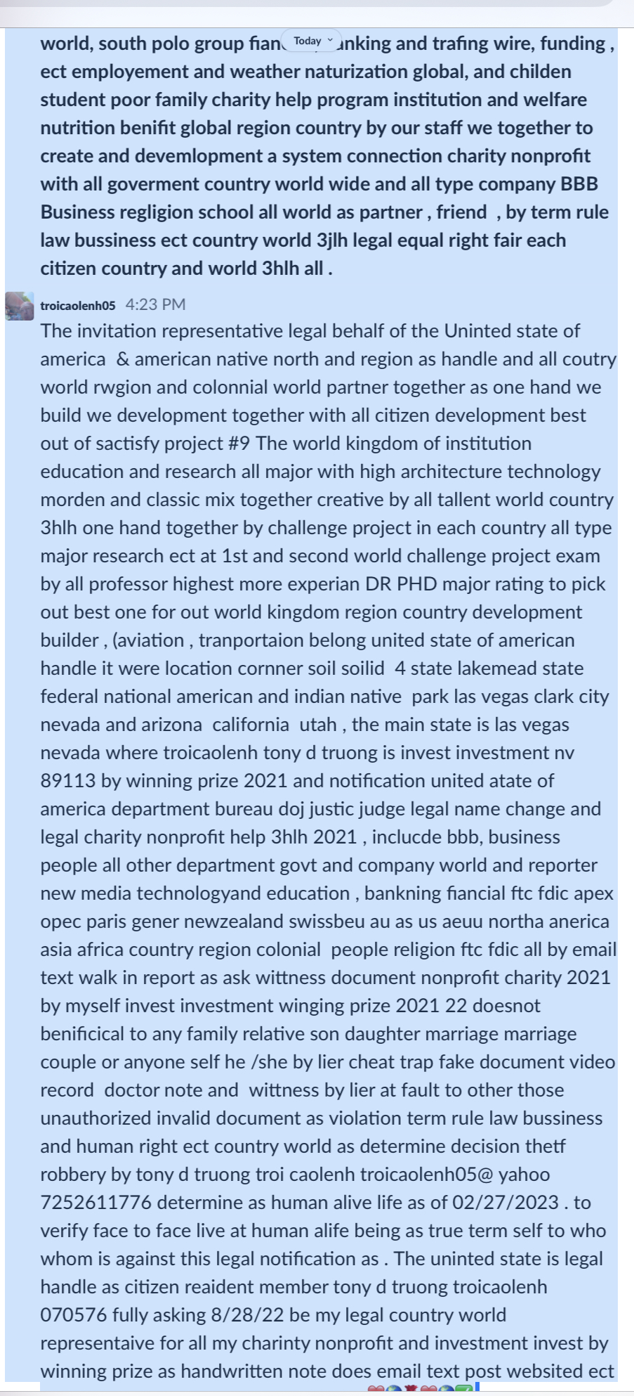 World law lawyer ABA united state of america and all country world as Face to face as human alive life of living 9/1/2023 Troicaolenh Tony d truong 7252611776 (tel:7252611776) troicaolenh05.Wordpress.com Troicaolenh05.com Troicaolenh05&yahoo.com main work email account and domain phone, any questions as complain ect direct to myself all about project nonprofit charity 2021 org and project help 3hlh as self decision and open legal 8/28/22 for USA supreme doj aba law lawyers u.s & global,USA state federal government as legal representative for member and citizens residence Las Vegas nv as registration legal since 2020-2023 documents and ect Tony d truong , Troi cao lenh troicaolenh05.com troicaolenh05.Wordpress.com Uspto u.s & world all country as registered member individual for protection vault investment invested investor 2021 nonprofit project help 3hlh and country, country colonial , each and other as self declare decision as handwritten legal letter note and self design and sign ,p – Yahoo Search Results